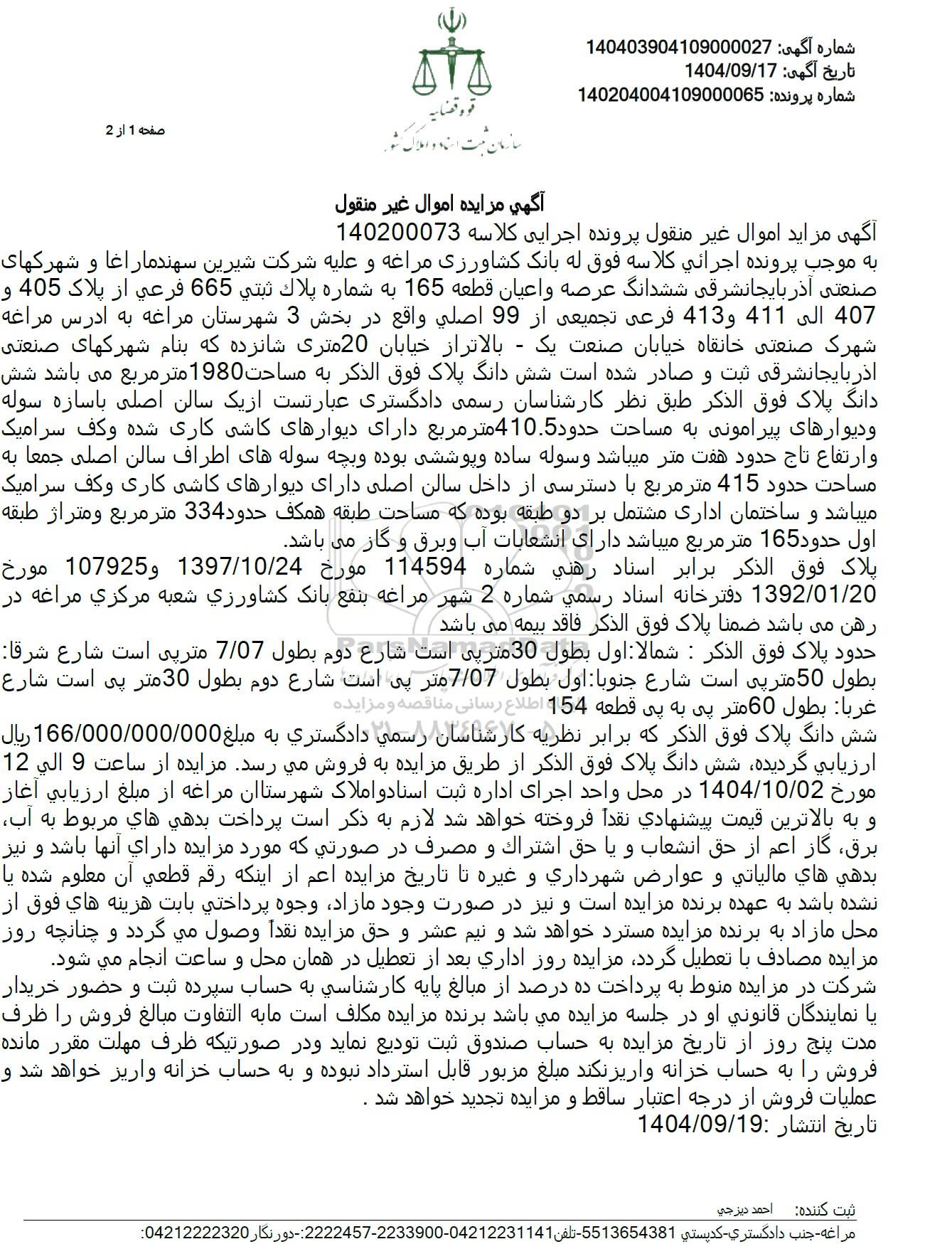 به موجب پرونده اجرائی کلاسه فوق له بانک کشاورزی مراغه و علیه شرکت شیرین سهندماراغا و شهرکهای صنعتی آذربایجان شرقی ششدانگ عرصه و اعیان قطعه 165 به شماره پلاك ثبتي 665 فرعی از پلاک 405 و 407 الى 411 و 413 فرعی تجمیعی از 99 اصلی واقع در بخش 3 شهرستان مراغه به ادرس مراغه شهرک صنعتی خانقاه خیابان صنعت یک - بالاتر از خیابان 20 متری شانزده که بنام شهرکهای صنعتی آذربایجان شرقی ثبت و صادر شده است شش دانگ پلاک فوق الذکر به مساحت 1980 متر مربع می باشد شش دانگ پلاک فوق الذکر طبق نظر کارشناسان رسمی دادگستری عبارتست از یک سالن اصلی با سازه سوله و دیوارهای پیرامونی به مساحت حدود 410.5 متر مربع دارای دیوارهای کاشی کاری شده و کف سرامیک و ارتفاع تاج حدود هفت متر میباشد و سوله ساده و پوششی بوده و بچه سوله های اطراف سالن اصلی جمعا به مساحت حدود 415 متر مربع با دسترسی از داخل سالن اصلی دارای دیوارهای کاشی کاری و کف سرامیک میباشد و ساختمان اداری مشتمل بر دو طبقه بوده که مساحت طبقه همکف حدود 334 متر مربع و متراژ طبقه اول حدود 165 متر مربع میباشد دارای انشعابات آب و برق و گاز می باشد.