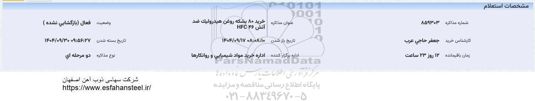 عنوان مذاکره: خرید 80 بشکه روغن هیدرولیک ضدآتش hfc46