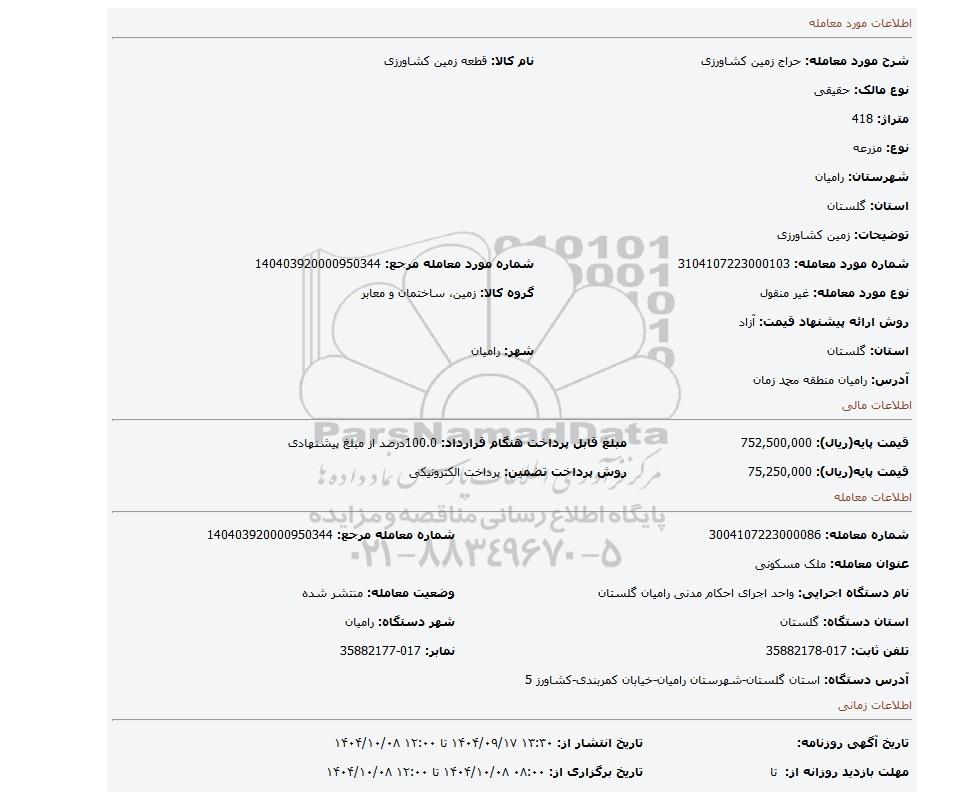 | نام دستگاه اجرایی: واحد اجرای احکام مدنی رامیان گلستان | وضعیت معامله: منتشر شده | |