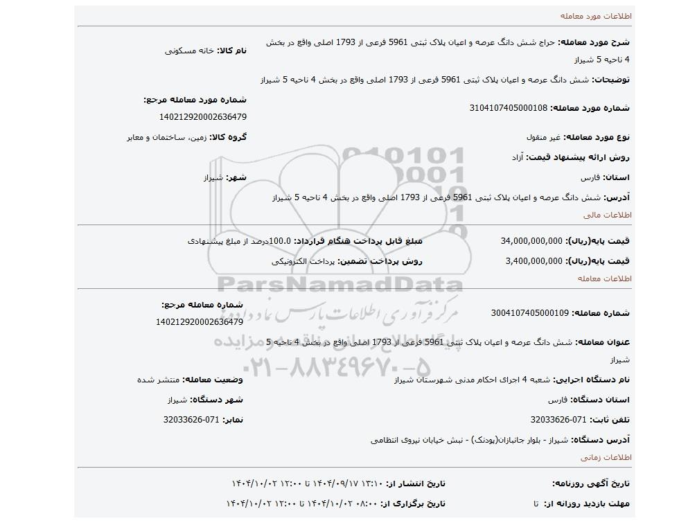 | شرح مورد معامله: حراج شش دانگ عرصه و اعیان پلاک ثبتی 5961 فرعی از 1793 اصلی واقع در بخش 4 ناحیه 5 شیراز | نام کالا: خانه مسکونی | |