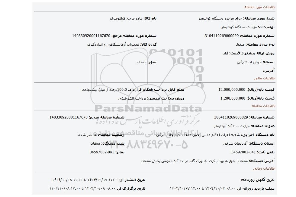 | عنوان معامله: مزایده دستگاه کوانتومتر | ||