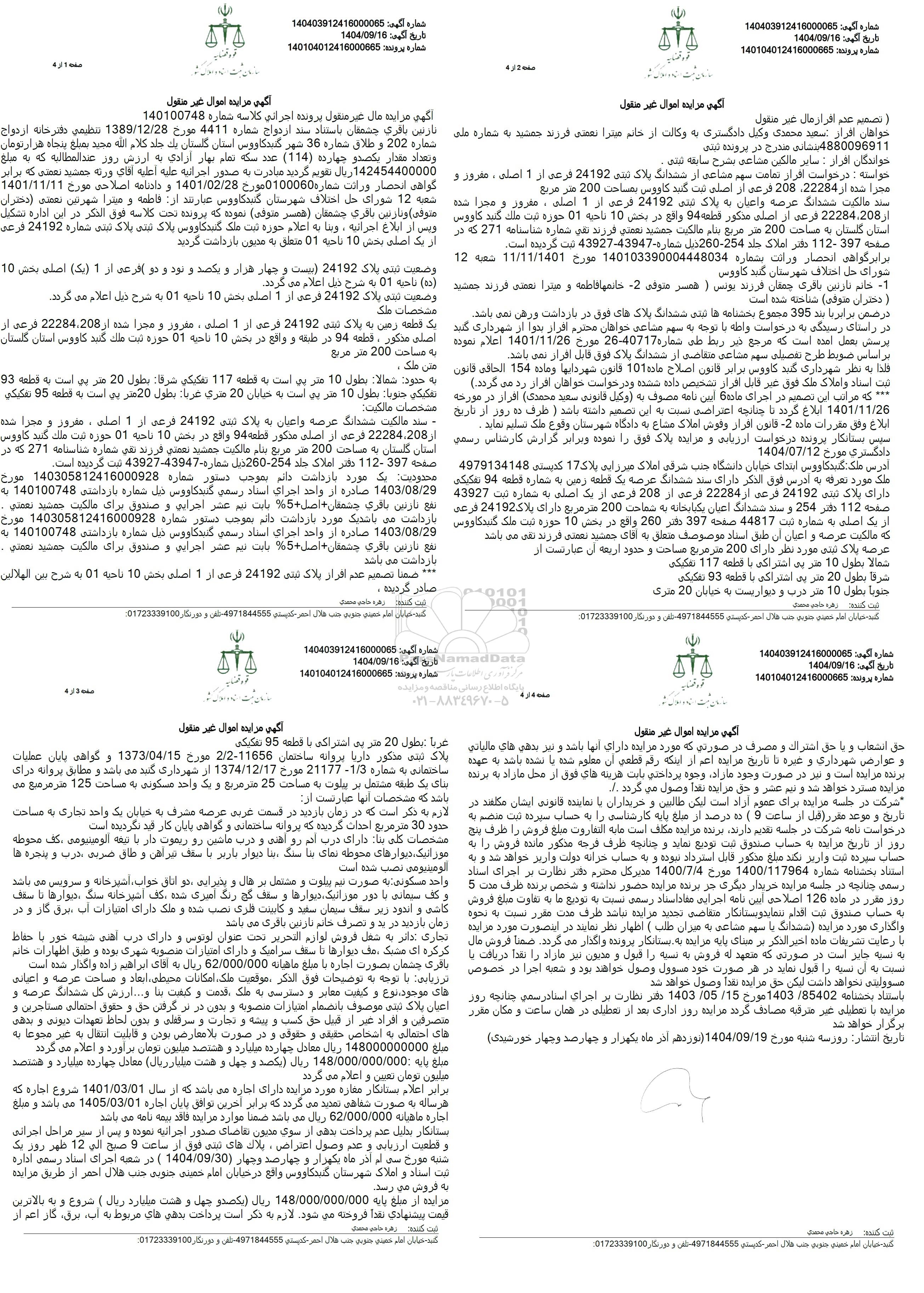 مزایده فروش یک قطعه زمین به پلاک ثبتی 24192 فرعی از 1 اصلی مفروز و مجزا شده از 208 ؛ 22284 فرعی از اصلی مذکور قطعه 94 در طبقه و واقع در بخش 10 ناحیه 01 به مساحت 200 مترمربع به مبلغ 148.000.000.000 ریال