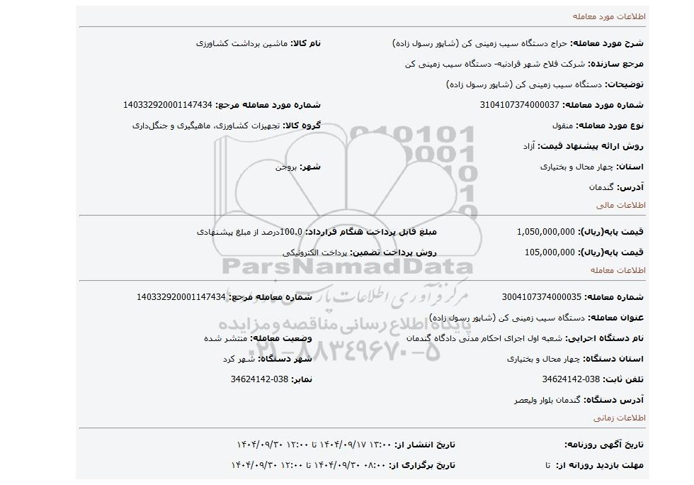 | شماره مورد معامله: 3104107374000037 | شماره مورد معامله مرجع: 140332920001147434 | |