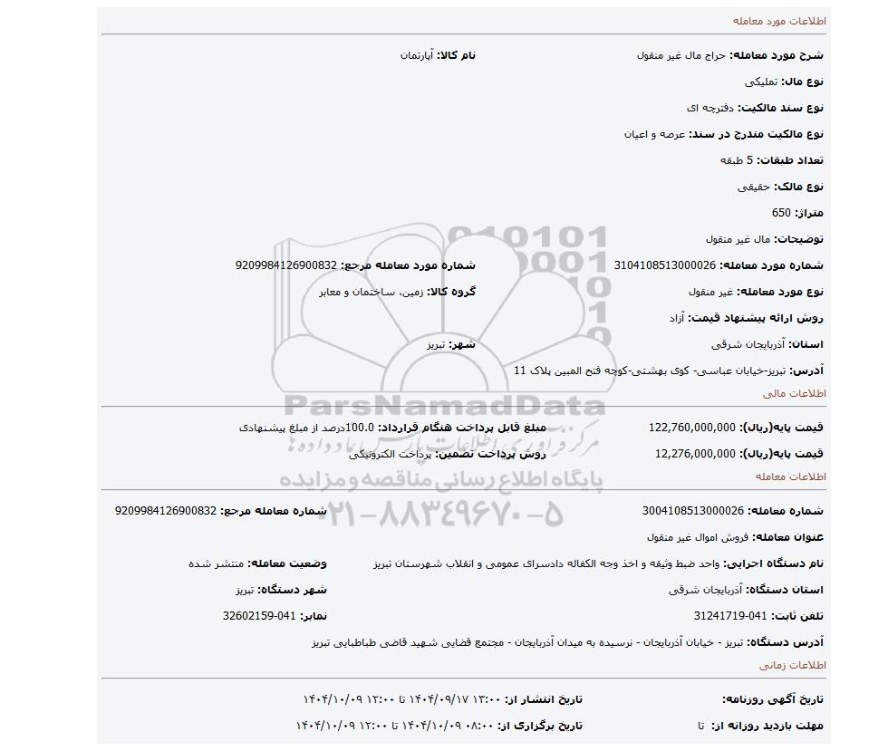 شرح مورد معامله: حراج مال غیر منقول نام کالا: آپارتمان