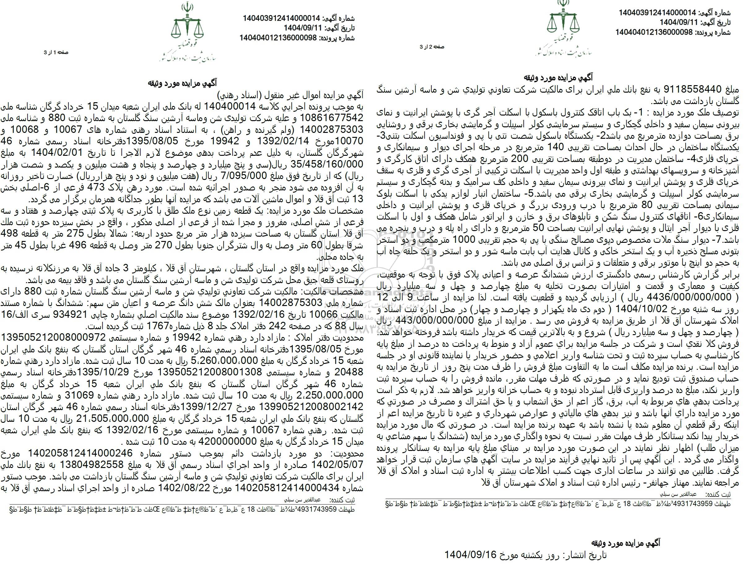 به موجب پرونده اجرایی کلاسه 140400014 له بانک ملی ایران شعبه میدان 15 خرداد گرگان شناسه ملی 10861677542 و علیه شرکت تولیدی شن و ماسه آرشین سنگ گلستان به شماره ثبت 880 و شناسه ملی 14002875303 (وام) گیرنده و راهن، به استناد استاد رفتی شماره های 10067 و 10068 و 46 10070 مورخ 1392.02.14 و 19942 مورخ 1395.08.05 دفترخانه اسناد رسمی شماره شهرگرگان گلستان به دلیل عدم پرداخت بدهی موضوع لازم الاجرا تا تاریخ 1404.02.01 به مبلغ 35.458.160.000 ریال سی و پنج میلیارد و چهارصد و پنجاه و هشت میلیون و یکصد و شصت هزار ریال که از تاریخ فوق مبلغ 7.095.000 ریال هفت میلیون و نود و پنج هزار ریال خسارت تاخیر روزانه به آن افزوده میشود منجر به صدور اجرائیه شده است. مورد رهن پلاک 473 فرعی از 6- اصلی بخش 13 ثبت آق قلا و اموال ماشین آلات می باشد که مزایده آنها بطور جداگانه همزمان برگزار می گردد.