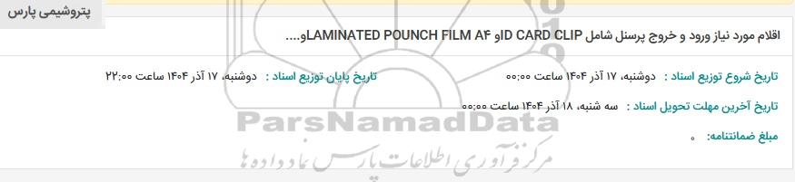 اقلام مورد نیاز ورود و خروج پرسنل شامل LAMINATED POUNCH FILM A ID CARD CLIP