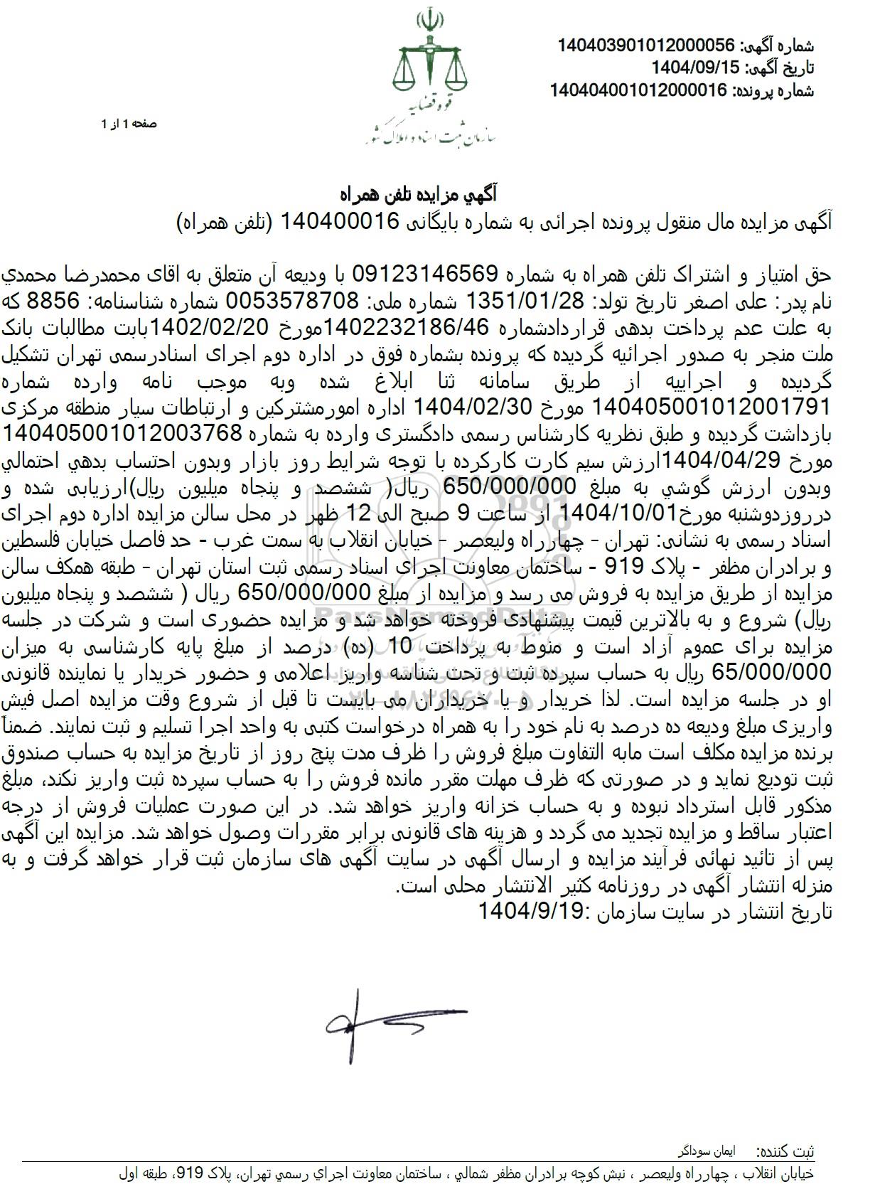 حق امتیاز و اشتراک تلفن همراه به شماره 09123146569 با ودیعه آن متعلق به آقای محمدرضا محمدي نام پدر: علی اصغر تاریخ تولد: 1351.01.28 شماره ملی 0053578708 شماره شناسنامه 8856 که به علت عدم پرداخت بدهی قرار داد شماره 1402232186.46 مورخ 1402.02.20 بابت مطالبات بانک ملت منجر به صدور اجرائیه گردیده که پرونده بشماره فوق در اداره دوم اجرای اسنادرسمی تهران تشکیل گردیده و اجراییه از طریق سامانه ثنا ابلاغ شده و به موجب نامه وارده شماره 140405001012001791 مورخ 1404.02.30 اداره امور مشترکین و ارتباطات سیار منطقه مرکزی بازداشت گردیده و طبق نظریه کارشناس رسمی دادگستری وارده به شماره 140405001012003768 مورخ 1404.04.29 ارزش سیم کارت کار کرده با توجه شرایط روز بازار و بدون احتساب بدهي احتمالي و بدون ارزش گوشی به مبلغ 650.000.000 ريال ) ششصد و پنجاه میلیون ریال ارزیابی شده و در روز دوشنبه مورخ 1404.10.01 از ساعت 9 صبح الى 12 ظهر در محل سالن مزایده اداره دوم اجرای اسناد رسمی به نشانی تهران - چهار راه ولیعصر - خیابان انقلاب به سمت غرب - حد فاصل خیابان فلسطین و برادران مظفر - پلاک 919 - ساختمان معاونت اجرای اسناد رسمی ثبت استان تهران - طبقه همکف سالن مزایده از طریق مزایده به فروش میرسد و مزایده از مبلغ 650.000.000 ريال ) ششصد و پنجاه میلیون ریال شروع و به بالاترین قیمت پیشنهادی فروخته خواهد شد و مزایده حضوری است و شرکت در جلسه مزایده برای عموم آزاد است و منوط به پرداخت 10 (ده) درصد از مبلغ پایه کارشناسی به میزان 65.000.000 ریال به حساب سپرده ثبت و تحت شناسه واریز اعلامی و حضور خریدار یا نماینده قانونی او در جلسه مزایده است. لذا خریدار و یا خریداران می بایست تا قبل از شروع وقت مزایده اصل فیش واریزی مبلغ ودیعه ده درصد به نام خود را به همراه درخواست کتبی به واحد اجرا تسلیم و ثبت نمایند. ضمنا برنده مزایده مکلف است ما به التفاوت مبلغ فروش را ظرف مدت پنج روز از تاریخ مزایده به حساب صندوق ثبت تودیع نماید و در صورتی که ظرف مهلت مقرر مانده فروش را به حساب سپرده ثبت واریز نکند، مبلغ مذکور قابل استرداد نبوده و به حساب خزانه واریز خواهد شد. در این صورت عملیات فروش از درجه اعتبار ساقط و مزایده تجدید میگردد و هزینه های قانونی برابر مقررات وصول خواهد شد. مزایده این آگهی پس از تائید نهایی فرآیند مزایده و ارسال آگهی در سایت آگهی های سازمان ثبت قرار خواهد گرفت و به منزله انتشار آگهی در روزنامه کثیر الانتشار محلی است.