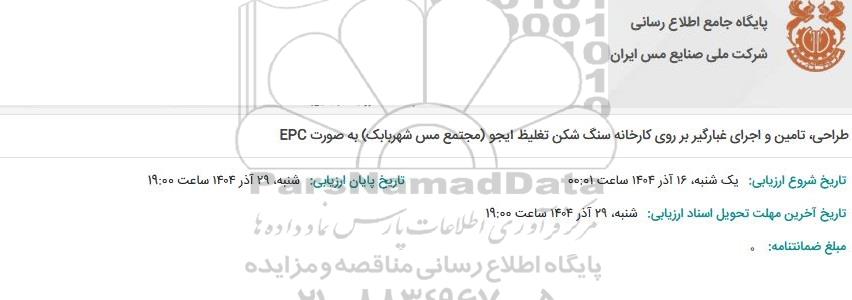 مناقصه طراحی، تامین و اجرای غبارگیر بر روی کارخانه سنگ شکن تغلیظ ایجو (مجتمع مس شهربابک) به صورت EPC -مناقصه روز دوشنبه هفدهم آذر ماه 1404 از کلیه افراد متخصص و شرکتها واجد شرایط دعوت به عمل میآید در مناقصه با کد خبرگزاری پارس نماد: 9964875 شرکت نمایند.