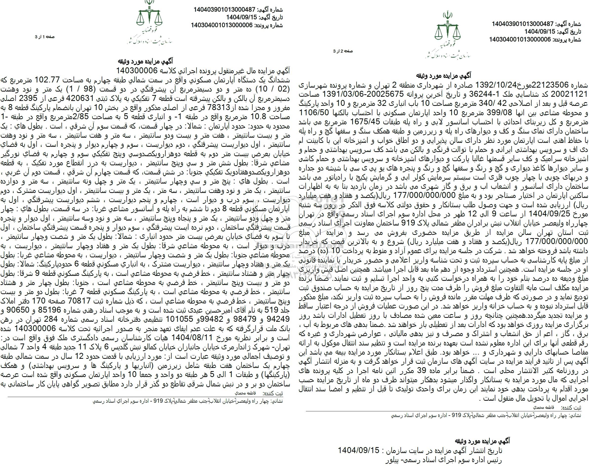 آگهی مزایده مال غیر منقول پرونده اجرائی كلاسه 140300006 ششدانگ یک دستگاه آپارتمان مسکونی واقع در سمت شمالی طبقه چهارم به مساحت 102.77 متر مربع که (02 . 10) ده متر و دو دسیمتر مربع آن پیشرفتگی در دو قسمت 98 . 1) یک متر و نود و هشت دسیمتر مربع آن بالکن و بالکن پیشرفته است قطعه 7 تفکیکی به پلاک ثبتی 420631 فرعی از 2395 اصلی مفرور و مجرا شده از 78313 فرعی از اصلی مذکور واقع در بخش 10 تهران با انضمام پارکینگ قطعه 8 به مرور مساحت 10.8 متر مربع واقع در طبقه -1 و انباری قطعه 5 به مساحت 2.85 متر مربع واقع در طبقه 1 محدود به حدود حدود آپارتمان : شمالا در چهار قسمت که قسمت سوم آن شرقی ، است . بطول های : یک متر و بیست سانتیمتر، هفت متر و بیست و دو سانتیمتر ، سه متر و هفت سانتیمتر، سه متر و نود و هفت سانتیمتر، اول دیواریست پیشرفتگی ، دوم دیواریست ، سوم و چهارم دیوار و پنجره است ، اول به فضای خیابان بعرض بیست متر دوم به قطعه دو هزار و یکصدوسی وینج تفكیكی سوم و چهارم به فضای نورگیر مشاعی شرقا بطول شش متر و سی وپنج سانتیمتر، دیواریست به درز انقطاع مورد تفکیک ، به قطعه دو هزار و یکصد و هفتاد و یک تفکیکی جنوبا در شش قسمت که قسمت چهارم آن شرقی، قسمت دوم أن غربی . است. بطول های : پنج متر و سی و چهار سانتیمتر، یک متر و چهل و نه سانتیمتر ، سه متر و دوازده سانتیمتر، یک متر و نود و هفت سانتیمتر ، سه متر ، یک متر و بیست سانتیمتر ، اول دیواریست مشترک ، دوم دیواریست ، سوم درب و دیوار است، چهارم و پنجم دیواریست، ششم دیواریست پیشرفتگی، اول به آپارتمان مسکونی قطعه 8 دوم تا ششم به راه پله و آسانسور مشاعی غربا در سه قسمت بطول های : چهار متر و چهل و دو سانتیمتر، یک متر و پنجاه وپنج سانتیمتر، سه متر و نود و سه سانتیمتر ، اول دیوار و پنجره قسمت پیشرفتگی ساختمان ، دوم نرده ایست پیشرفتگی ، سوم دیوار و پنجره قسمت پیشرفتگی ساختمان ، اول تا سوم به فضای خیابان بعرض بیست متر حدود انباری : شمالا بطول یک متر و شصت و چهار سانتیمتر . درب و دیوار است . به محوطه مشاعی شرقا بطول یک متر و هفتاد و چهار سانتیمتر ، دیواریست ، به محوطه مشاعی جنوبا بطول یک متر و شصت و چهار سانتیمتر ، دیواریست، به محوطه مشاعی غربا : بطول یک متر و هفتاد و چهار سانتیمتر ، دیواریست مشترک ، به انباری مسکونی قطعه 6 حدود پارکینگ: شمالا : بطول چهار متر و هشتاد سانتیمتر ، خط فرضی به محوطه مشاعی است ، به پارکینگ مسكونی قطعه 9 شرقا بطول دو متر و بیست و پنج سانتیمتر ، خط فرضی به محوطه مشاعی است، جنوبا بطول چهار متر و هشتاد سانتیمتر ، خط فرضی به محوطه مشاعی است، به پارکینگ مسكونی قطعه 7 غربا بطول دو متر و بیست و پنج سانتیمتر ، خط فرضی به محوطه مشاعی است ، که ذیل شماره ثبت 70817 صفحه 170 دفتر املاک جلد 519 به نام آقای امیر حسین عیدی ثبت شده است و به موجب استاد رهنی شماره 85196 و 90650 و 94249 و 98479 و 99482 و 101055 تنظیمی دفترخانه اسناد رسمی شماره 284 تهران در رهن بانک ملت قرار گرفته که به علت عدم ایفای تعهد منجر به صدور اجرائیه تحت کلاسه 140300006 شده است و برابر نظریه مورخ 1404.08.11 هیات کارشناسان رسمی دادگستری ملک فوق واقع است در تهران شهرک ژاندارمری خیابان جانبازان خیابان کمالو نبش گلدیس 6 پلاک 11 جدید طبقه 4 واحد 7 شمالی و توصیف اجمالی مورد وثیقه عبارت است از مورد ارزیابی با قدمت حدود 12 سال در سمت شمالی طبقه چهارم یک ساختمان هفت طبقه شامل زیر زمین انباریها و پارکینگ ها و سرویس بهداشتی و همکف پارکینگها) و طبقات 1 الی 5 هر طبقه دو واحد و جمعا 10 واحد آپارتمان مسکونی واقع شده است عرصه ساختمان دو بر و در نبش شمال شرقی تقاطع دو گذر قرار دارد مطابق تصویر گواهی پایان کار ساختمانی به شماره 22123506 مورخ 1392.10.24 صادره از شهرداری منطقه 2 تهران و شماره پرونده شهرسازی 20021121 کد شناسایی ملک 1-36244 و تاریخ آخرین پروانه 20025675-1391.03.06 مساحت عرصه قبل و بعد از اصلاحی 340.42 متر مربع مساحت 10 باب انباری 32 متر مربع و 10 واحد پارکینگ و محوطه مشاعی بین آنها 399.08 متر مربع 10 واحد آپارتمان مسکونی با احتس