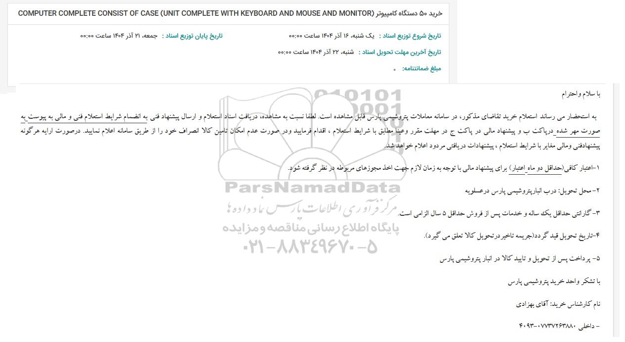 خرید 50 دستگاه کامپیوتر COMPUTER COMPLETE CONSIST OF CASE (UNIT COMPLETE WITH KEYBOARD AND MOUSE AND MONITOR