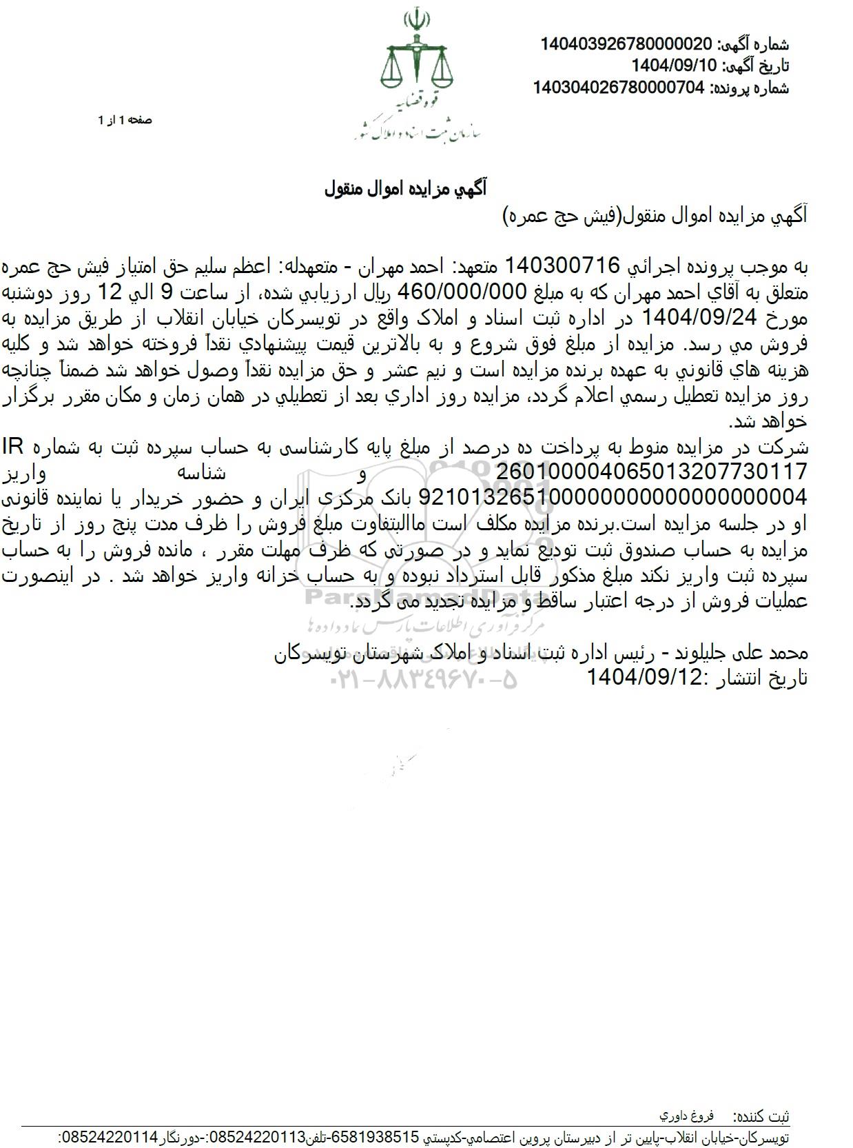 به موجب پرونده اجرائي 140300716 متعهد احمد مهران - متعهدله اعظم سليم حق امتیاز فیش حج عمره متعلق به آقای احمد مهران که به مبلغ 460.000.000 ريال ارزيابي شده از ساعت 9 الی 12 روز دوشنبه مورخ 1404.09.24 در اداره ثبت اسناد و املاک واقع در تویسرکان خیابان انقلاب از طریق مزایده به فروش میرسد مزایده از مبلغ فوق شروع و به بالاترین قیمت پیشنهادی نقداً فروخته خواهد شد و کلیه هزينه هاي قانوني به عهده برنده مزایده است و نیم عشر و حق مزایده نقداً وصول خواهد شد ضمنا چنانچه روز مزایده تعطیل رسمي اعلام گردد مزایده روز اداری بعد از تعطیلی در همان زمان و مکان مقرر برگزار خواهد شد.