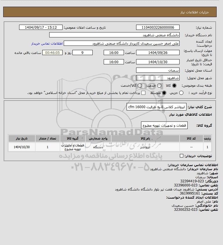 شرح کلی نیاز: ایرواشر کلاس 8 به ظرفیت 16000 cfm