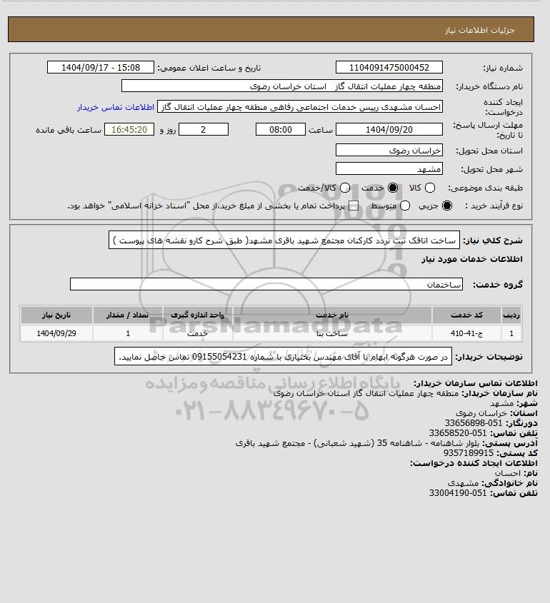 شرح کلی نیاز: ساخت اتاقک ثبت تردد کارکنان مجتمع شهید باقری مشهد( طبق شرح کارو نقشه های پیوست )