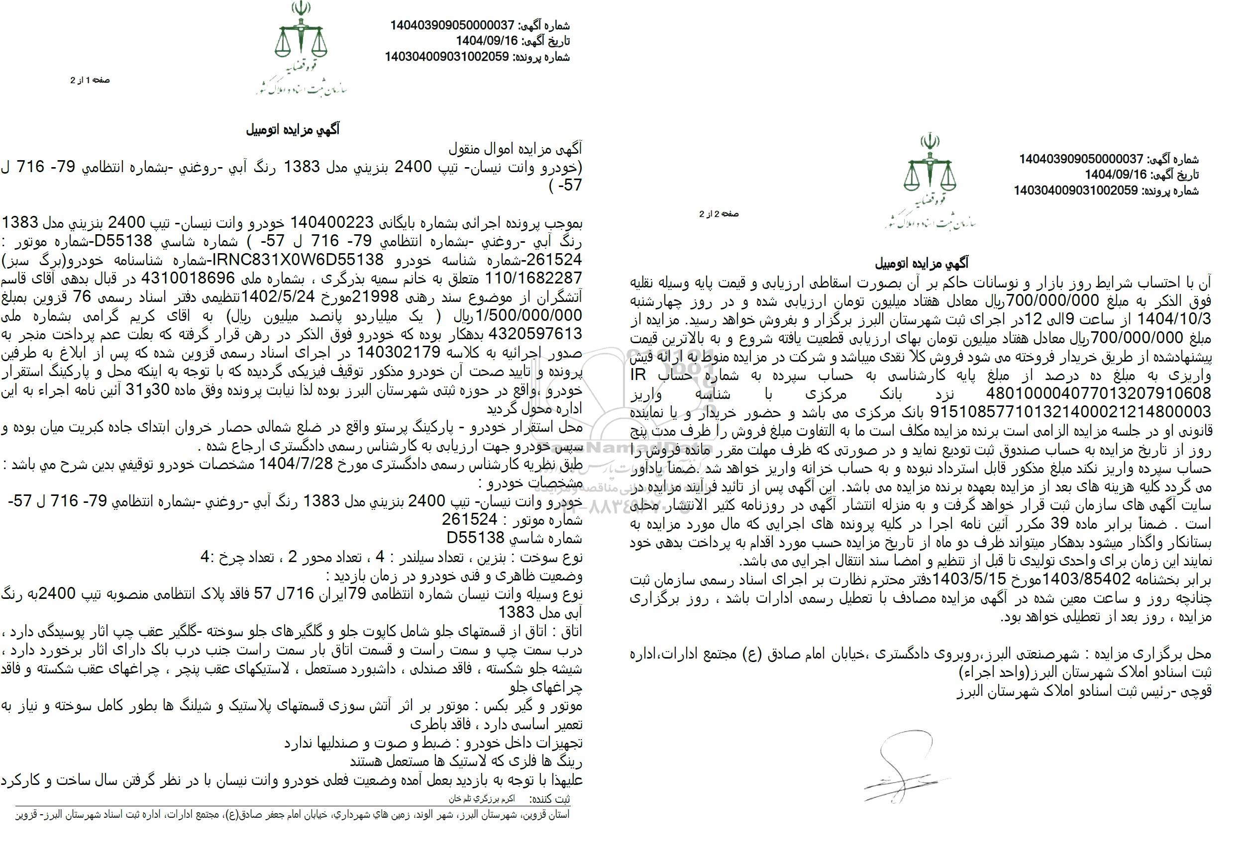 بموجب پرونده اجرائی بشماره بایگانی 140400223 خودرو وانت نیسان تیپ 2400 بنزینی مدل 1383 رنگ آبی روغنی بشماره انتظامی -71679 ل -57 ) شماره شاسی D55138 - شماره موتور :