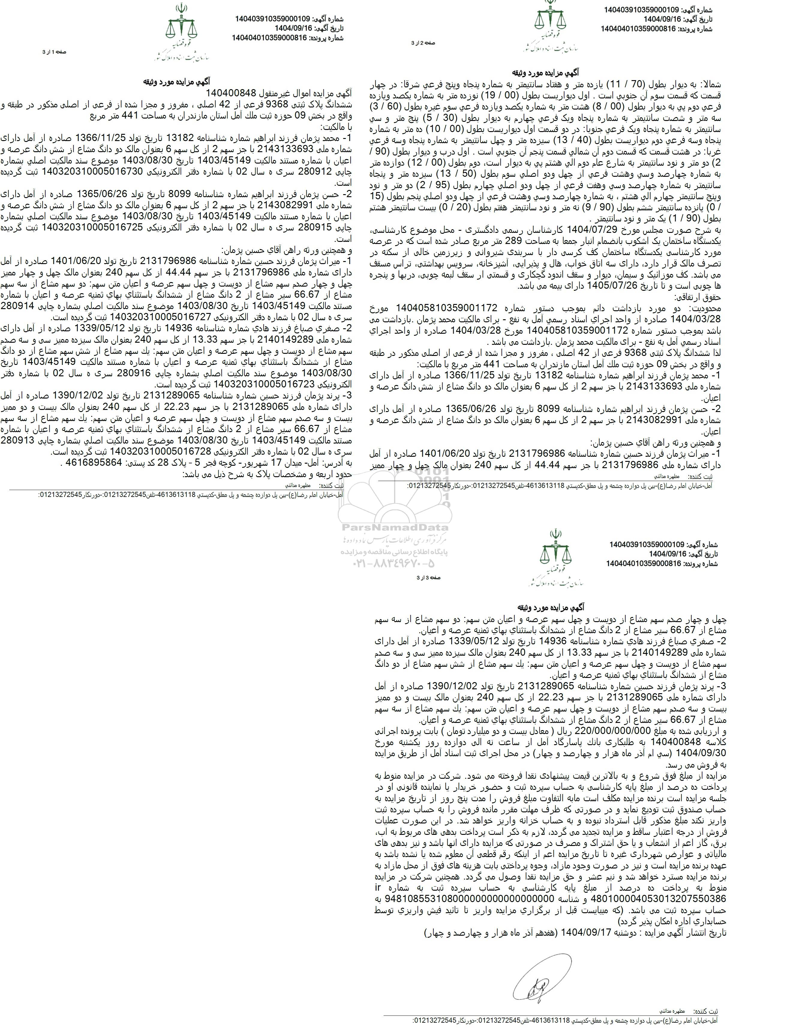 تمام آگهی ها طبق نمونه تصویر آگهی صرفا جهت اطلاع رسانی می باشد در خصوص استفاده از این آگهی هر گونه مسئولیت پرداخت به آگهی دهنده و بررسی و احراز هویت به عهده شرکت کنندگان می باشد و پایگاه خبری پارس نماد هیچگونه منفعت و مسئولیتی بابت تعهد این آگهی ندارد.