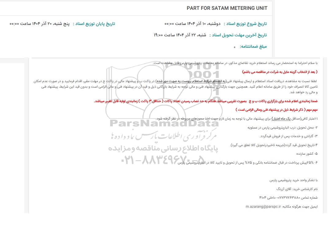 استعلام بها و موضوع استعلام استعلام PART FOR SATAM METERING UNIT به اطلاع کلیه شرکتها و افراد متخصص واجد شرایط میرساند، آگهی گذار در نظر دارد از طریق استعلام بها، نسبت به انتخاب و دریافت پیشنهادات اقدام نماید. این استعلام با کد آگهی ثبت شده در سامانه خبرگزاری پارس نماد : 9964907 منتشر شده است. مشخصات استعلام : تاریخ شروع استعلام: 1404/09/17 آخرین مهلت ارسال پیشنهاد قیمت : 1404/09/20 و محل اجرای پروژه : استان مناقصات استان بوشهر میباشد. استعلام قیمت مورد درخواست : استعلام PART FOR SATAM METERING UNIT با دستهبندیهای تخصصی و گروه های مرتبط : ابزار دقیق, تجهیزات نفت و گاز, استعلام اطلاع رسانی میگردد.