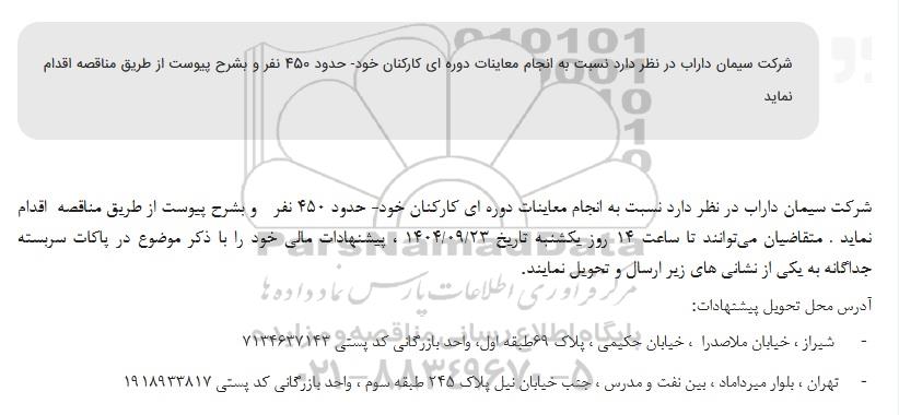 شرکت سیمان داراب در نظر دارد نسبت به انجام معاینات دوره ای کارکنان خود حدود 450 نفر و بشرح پیوست از طریق مناقصه اقدام نماید.