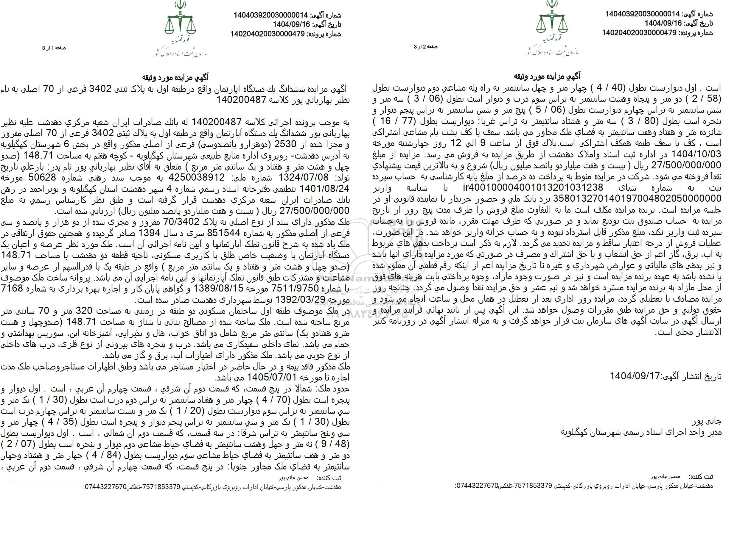 به موجب پرونده اجرائی کلاسه 140200487 له بانک صادرات ایران شعبه مرکزی دهدشت علیه نظیر بهاریانی پور ششدانگ یک دستگاه آپارتمان واقع در طبقه اول به پلاک ثبتی 3402 فرعی از 70 اصلی مقروز و مجزا شده از 2530 دوهزار و پانصدوسی فرعی از اصلی مذکور واقع در بخش 6 شهرستان کهگیلویه به آدرس دهدشت روبروی اداره منابع طبیعی شهرستان کهگیلویه - کوچه هفتم به مساحت 148.71 صدو چهل و هشت متر و هفتاد و یک سانتی متر مربع ( متعلق به آقای نظیر بهاریانی پور نام پدر باز علی تاریخ تولد 1324.07.08 شماره ملی 4250038912 به موجب سند رهنی شماره 50628 مورخه 1401.08.24 تنظیمی دفترخانه اسناد رسمی شماره 4 شهر دهدشت استان کهگیلویه و بویر احمد در رهن بانک صادرات ایران شعبه مرکزی دهدشت قرار گرفته است و طبق نظر کارشناس رسمی به مبلغ 27.500.000.000 ریال ) بیست و هفت میلیارد و پانصد میلیون ریال ارزیابی شده است.
