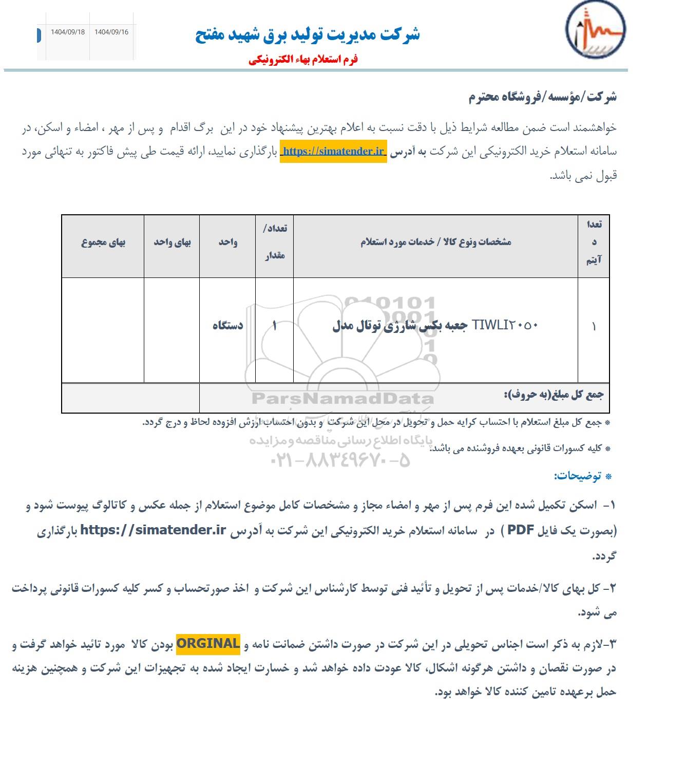 خواهشمند است ضمن مطالعه شرایط ذیل با دقت نسبت به اعلام بهترین پیشنهاد خود در این برگ اقدام و پس از مهر ، امضاء و اسکن در سامانه استعلام خرید الکترونیکی این شرکت به آدرس https://simatender.ir بارگذاری نمایید ارائه قیمت طی پیش فاکتور به تنهایی مورد قبول نمی باشد.
