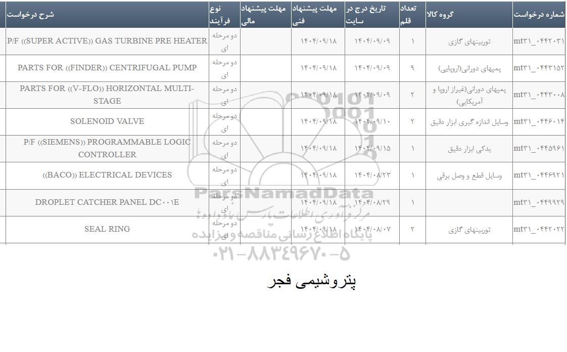 | شماره درخواست | گروه کالا | تعداد قلم | مهلت پیشنهاد فنی | نوع فرایند | شرح درخواست |
