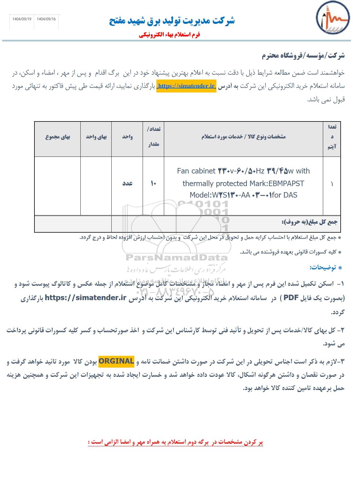 خواهشمند است ضمن مطالعه شرایط ذیل با دقت نسبت به اعلام بهترین پیشنهاد خود در این برگ اقدام و پس از مهر ، امضاء و اسکن در سامانه استعلام خرید الکترونیکی این شرکت به آدرس https://simatender.ir بارگذاری نمایید ارائه قیمت طی پیش فاکتور به تنهایی مورد قبول نمی باشد.