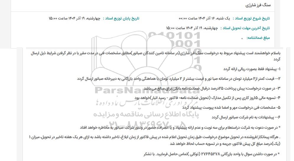 تاریخ آخرین مهلت تحویل اسناد : چهارشنبه 19 آذر 1404 ساعت 15:00