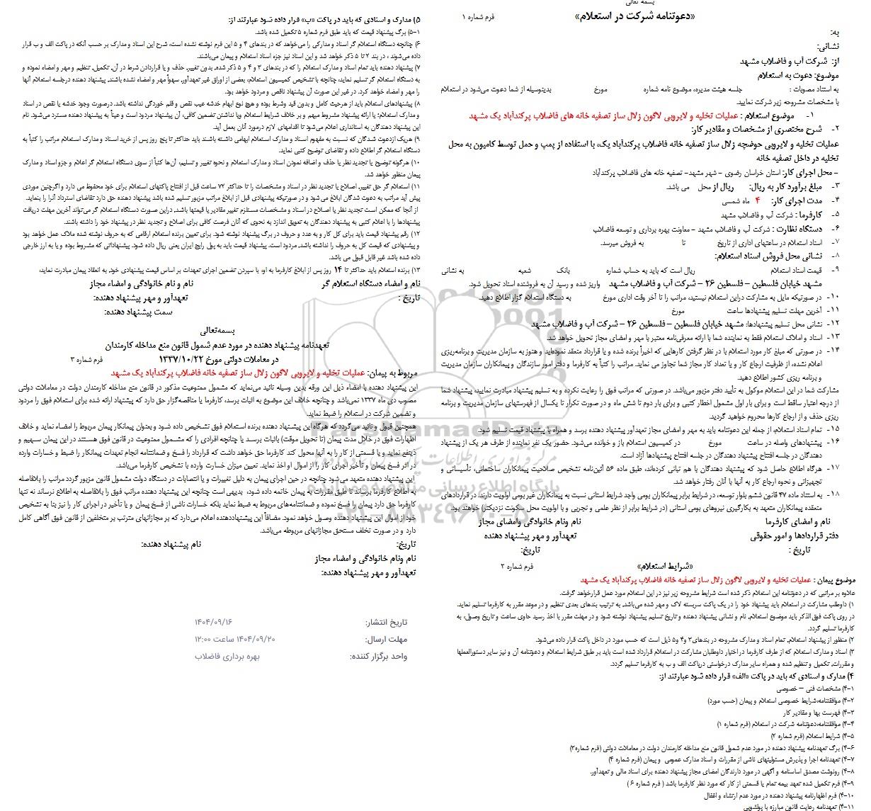 مربوط به پیمان عملیات تخلیه و لایروبی لاگون زلال ساز تصفیه خانه فاضلاب پر کند آباد یک مشهد