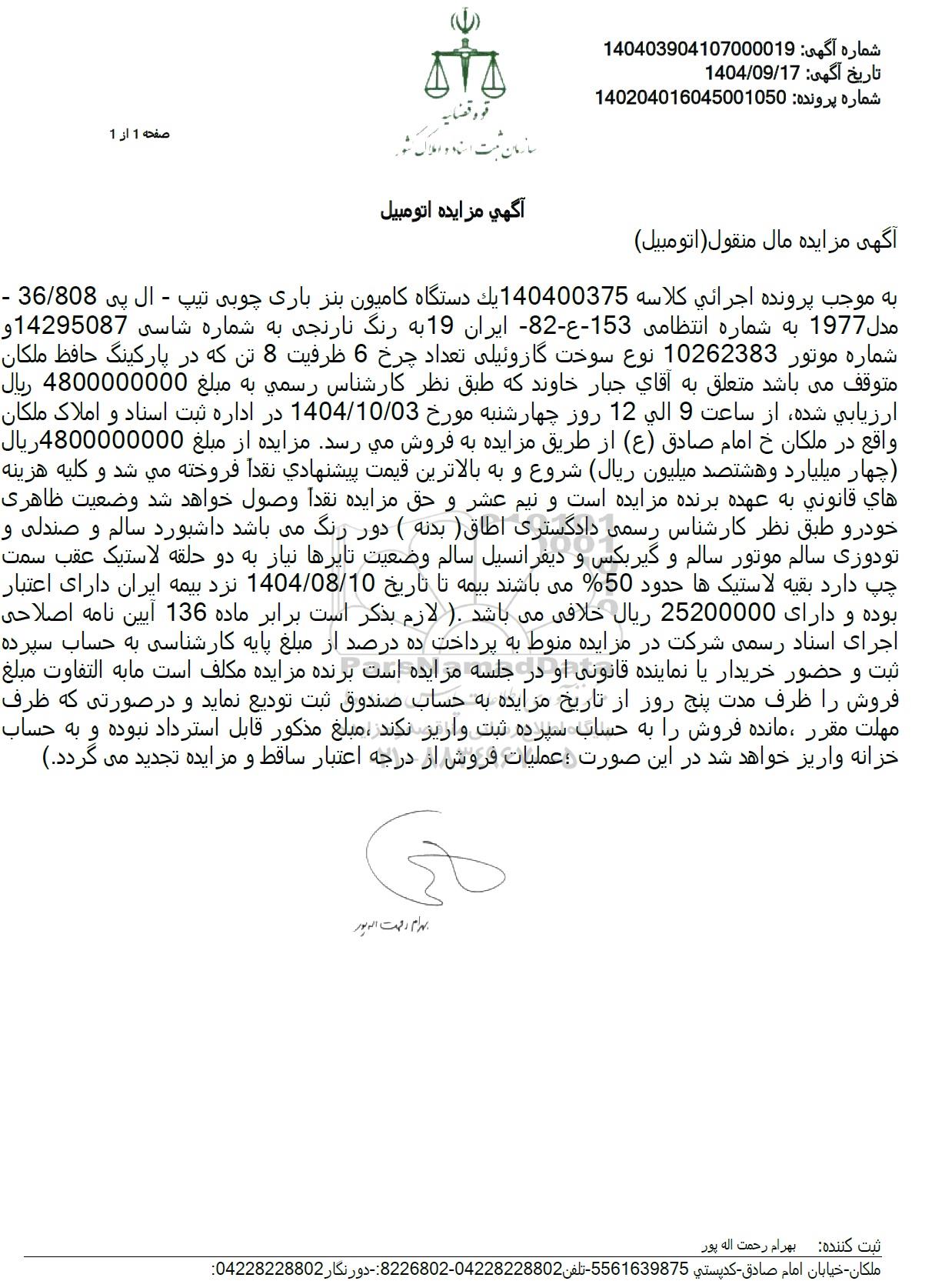 به موجب پرونده اجرائی کلاسه 140400375 يک دستگاه کامیون بنز باری چوبی تیپ - ال پی 36.808 -مدل 1977 به شماره انتظامی -153--2- ایران 19 به رنگ نارنجی به شماره شاسی 14295087 و شماره موتور 10262383 نوع سوخت گازوئیلی تعداد چرخ 6 ظرفیت 8 تن که در پارکینگ حافظ ملکان متوقف می باشد متعلق به آقای جبار خاوند که طبق نظر کارشناس رسمي به مبلغ 4800000000 ريال ارزیابی شده از ساعت 9 الی 12 روز چهارشنبه مورخ 1404.10.03 در اداره ثبت اسناد و املاک ملکان واقع در ملکان خ امام صادق (ع) از طریق مزایده به فروش می رسد. مزایده از مبلغ 4800000000 ريال چهار میلیارد و هشتصد میلیون ریال شروع و به بالاترین قیمت پیشنهادی نقدا فروخته مي شد و کلیه هزینه هاي قانوني به عهده برنده مزایده است و نیم عشر و حق مزایده نقداً وصول خواهد شد وضعیت ظاهری خودرو طبق نظر کارشناس رسمی دادگستری اطاق(بدنه ) دور رنگ میباشد داشبورد سالم و صندلی و تودوزی سالم موتور سالم و گیربکس و دیفرانسیل سالم وضعیت تایرها نیاز به دو حلقه لاستیک عقب سمت چپ دارد بقیه لاستیک ها حدود 50 میباشند بیمه تا تاریخ 1404.08.10 نزد بیمه ایران دارای اعتبار بوده و دارای 25200000 ريال خلافی می باشد . لازم بذکر است برابر ماده 136 آیین نامه اصلاحی اجرای اسناد رسمی شرکت در مزایده منوط به پرداخت ده درصد از مبلغ پایه کارشناسی به حساب سپرده ثبت و حضور خریدار یا نماینده قانونی او در جلسه مزایده است برنده مزایده مکلف است ما به التفاوت مبلغ فروش را ظرف مدت پنج روز از تاریخ مزایده به حساب صندوق ثبت تودیع نماید و در صورتی که ظرف مهلت مقرر مانده فروش را به حساب سپرده ثبت واریز نکند ، مبلغ مذکور قابل استرداد نبوده و به حساب خزانه واریز خواهد شد در این صورت ؛ عملیات فروش از درجه اعتبار ساقط و مزایده تجدید می گردد.