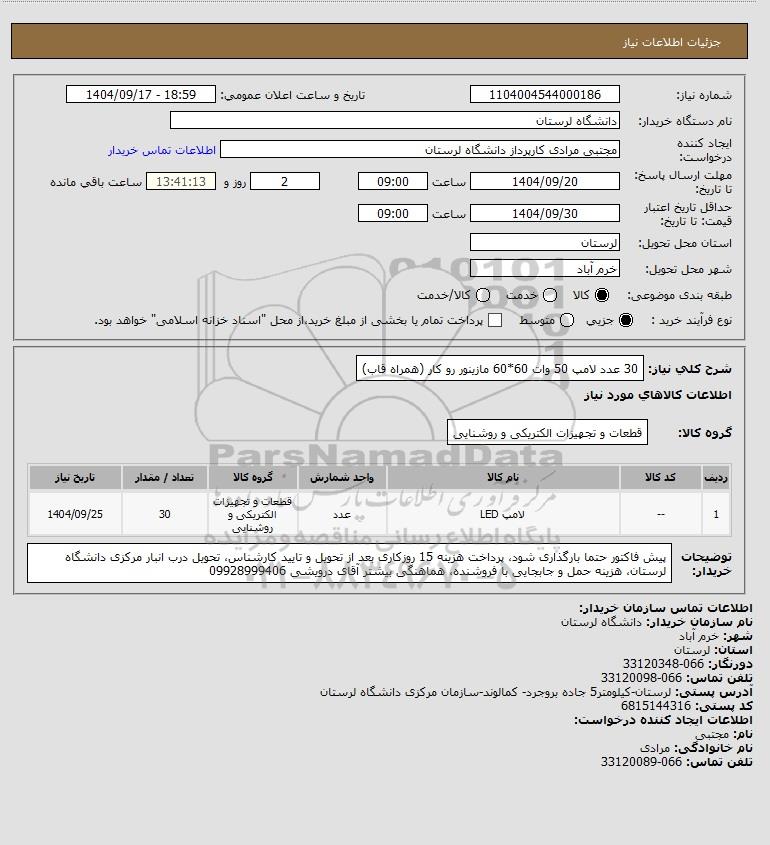 | 1 | -- | لامپ LED | عدد | قطعات و تجهیزات الکتریکی و روشنایی | 30 | 1404/09/25 |