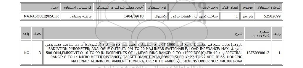 | 52502699 | پایرومتر | 1 | ساخت تجهیزات و قطعات یدکی | کشوری | 1404/09/18 | مرضیه رسولی | MA.RASOULI@KSC.IR |