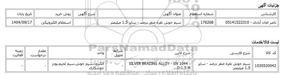 ناصر امان آبادی - 05141522310176268سیم جوش نقره صفر درصد - سایز 1.5 میلیمتراستعلام الکترونیکی1404/09/17
