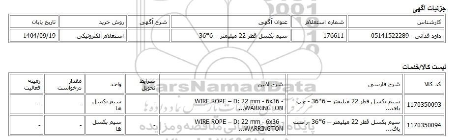 | داود فدائی - 05141522289 | 176611 | سیم بکسل قطر 22 میلیمتر – 6*36 | استعلام الکترونیکی | 1404/09/19 |