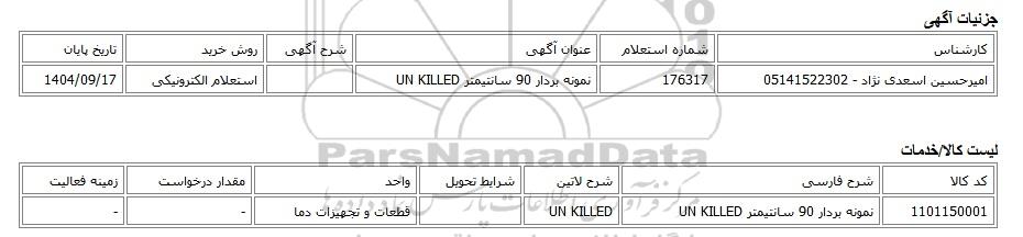 | امیرحسین اسعدی نژاد - 05141522302 | 176317 | نمونه بردار 90 سانتیمتر UN KILLED | استعلام الکترونیکی | 1404/09/17 |