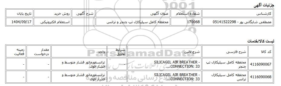 | مصطفی شایگانی پور - 05141522298 | 170068 | محفظه کامل سیلیکاژل تپ چنجر و ترانس | استعلام الکترونیکی | 1404/09/17 |