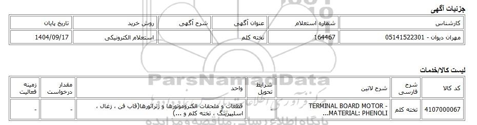 | مهران دیوان - 05141522301 | 164467 | تخته کلم | استعلام الکترونیکی | 1404/09/17 |