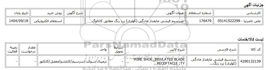 | علی ناصرنیا - 05141522299 | 176479 | سرسیم فیشی عایقدار مادگی (کولری) زرد رنگ مطابق کاتالوگ | استعلام الکترونیکی | 1404/09/18 |