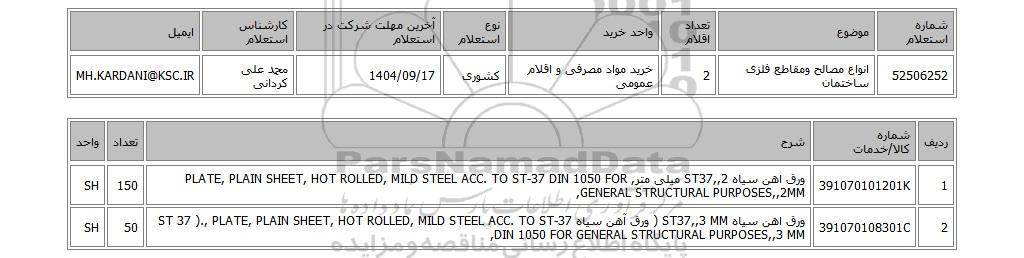 | 52506252 | انواع مصالح ومقاطع فلزی ساختمان | 2 | خرید مواد مصرفی و اقلام عمومی | کشوری | 1404/09/17 | محمد علی کردانی | MH.KARDANI@KSC.IR |
