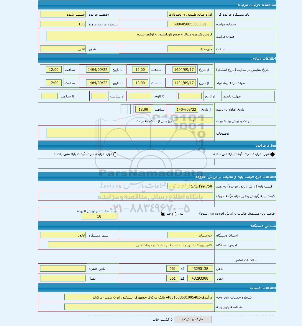 | نام دستگاه مزایده گزار | اداره منابع طبیعی و ابخیزداری شهرستان لالی | وضعیت مزایده | منتشر شده | |