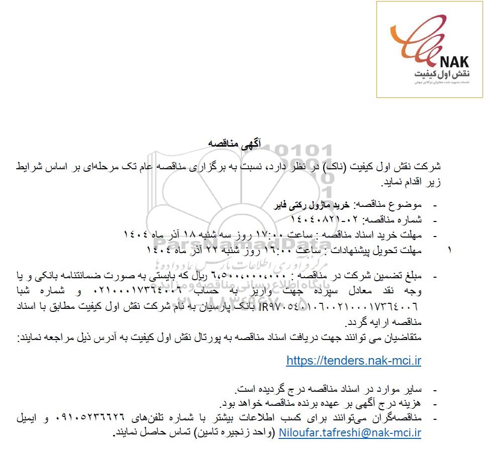 - مناقصه گران می توانند برای کسب اطلاعات بیشتر با شماره تلفن های 09105236626 و ایمیل Niloufar.tafreshi@nak-mci.ir (واحد زنجیره تامین) تماس حاصل نمایند.