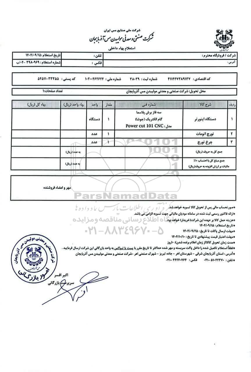 | 1 | دستگاه اینورتر | سه فاز برش پلاسما گام الکتریک (جوشا) مدل: Power cut 101 CNC |