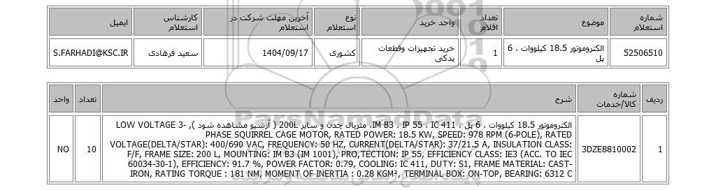 | 52506510 | الکتروموتور 18.5 کیلووات ، 6 پل | 1 | خرید تجهیزات وقطعات یدکی | کشوری | 1404/09/17 | سعید فرهادی | S.FARHADI@KSC.IR |