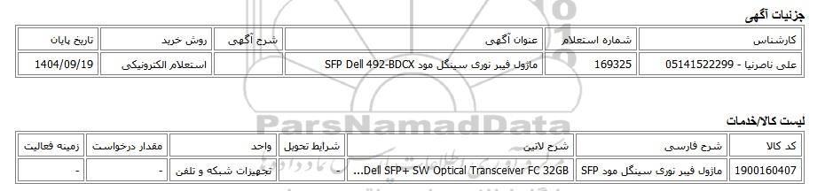 | علی ناصرنیا - 05141522299 | 169325 | ماژول فیبر نوری سینگل مود SFP Dell 492-BDCX | استعلام الکترونیکی | 1404/09/19 |