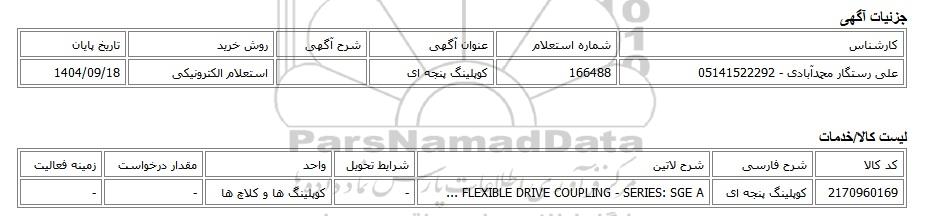 | علی رستگار محمدآبادی - 05141522292 | 166488 | کوپلینگ پنجه ای | استعلام الکترونیکی | 1404/09/18 |