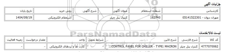 | مهران دیوان - 05141522301 | 162740 | کنترل پنل چیلر | استعلام الکترونیکی | 1404/09/19 |