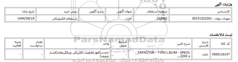 | مهران دیوان - 05141522301 | 163962 | خازن | استعلام الکترونیکی | 1404/09/19 |