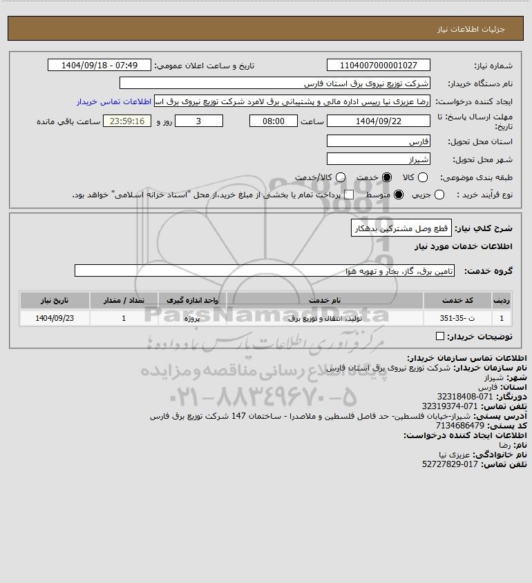 نام دستگاه خریدار:شرکت توزیع نیروی برق استان فارس