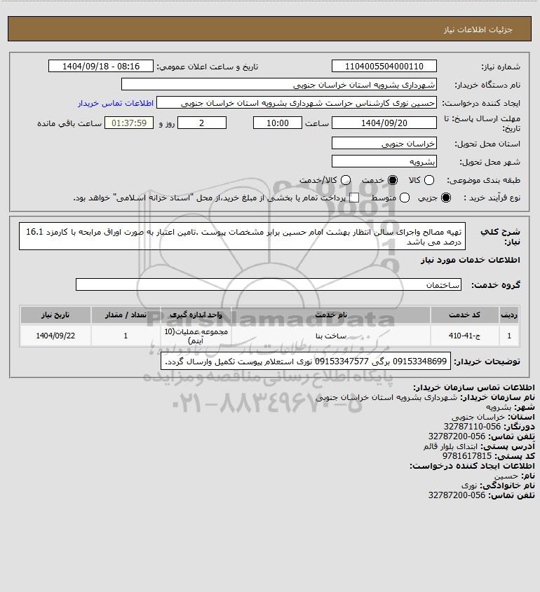 شرح کلی نیاز: تهیه مصالح واجرای سالن انتظار بهشت امام حسین برابر مشخصات پیوست .تامین اعتبار به صورت اوراق مرابحه با کارمزد 16.1 درصد می باشد