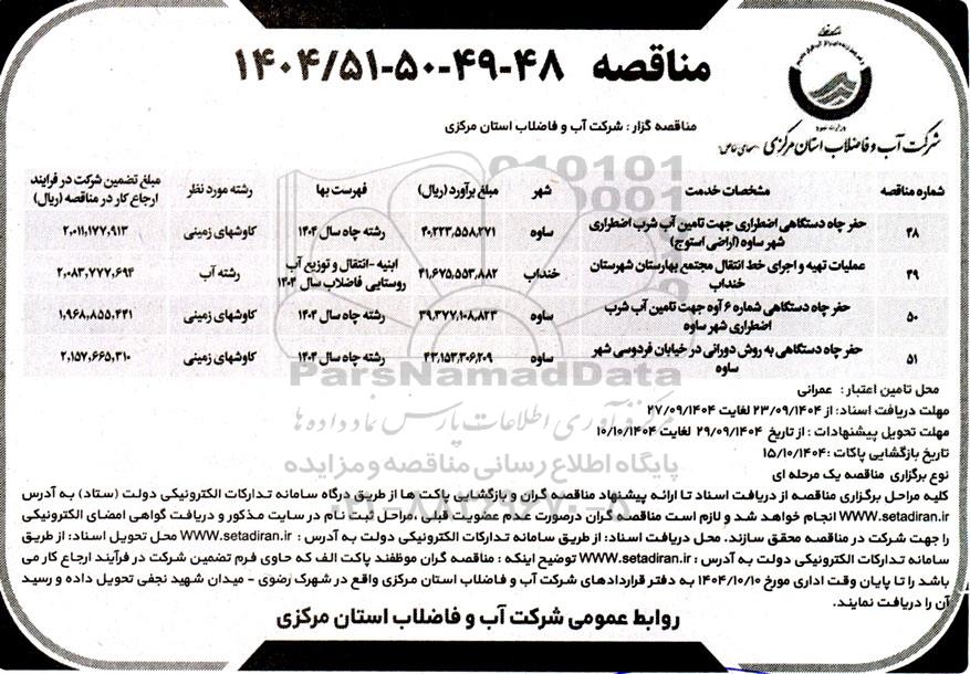 | 50 | حفر چاه دستگاهی شماره 6 آوه جهت تامین آب شرب اضطراری شهر ساوه | ساوه | 39.377.108.823 | رشته چاه سال 1404 | کاوشهای زمینی | 1.968.855.441 |