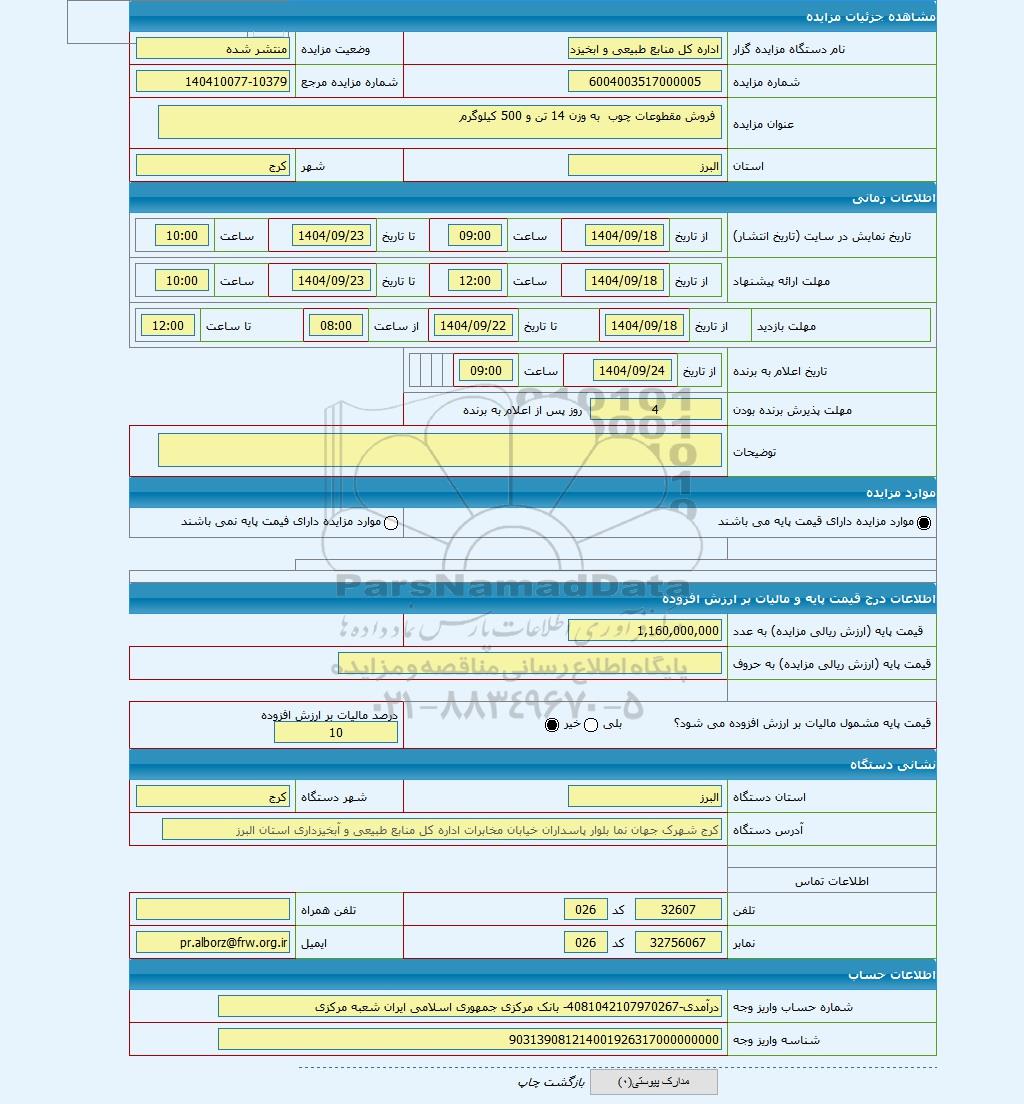 | نام دستگاه مزایده گزار | اداره کل منابع طبیعی و ابخیزداری استان البرز | وضعیت مزایده | منتشر شده | |