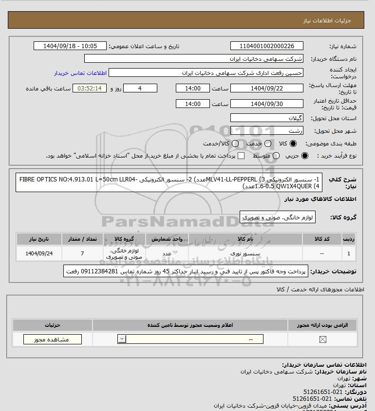 | 1 | -- | سنسور نوری | عدد | لوازم خانگی، صوتی و تصویری | 7 | 1404/09/24 |